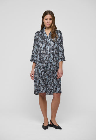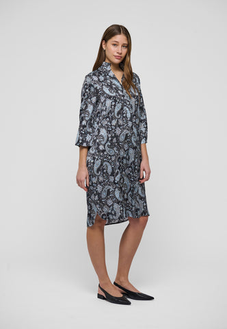 En af Dea Kudibals mest populære og tidløse styles – denne løstsiddende kjole til midt på læggen passer til alle kropsformer. Kimono-udskæring og krave giver kjolen elegance, mens de dybe ærmer med betrukne knapper tilfører et afslappet udtryk. Denne smukke version er i sort silke med et all-over print af blå paisley-mønstre.