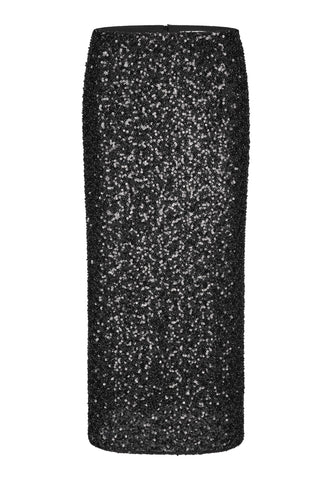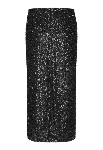 Et perfekt eksempel på underspillet luksus, denne slim fit tubenederdel er helt beklædt med sorte pailletter. Den lukkes bagpå med en usynlig lynlås og kan bæres med en strik eller simpel skjorte eller t-shirt. For et mere glamorøst udtryk kan den kombineres med den matchende Anine-top.