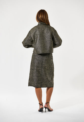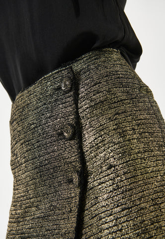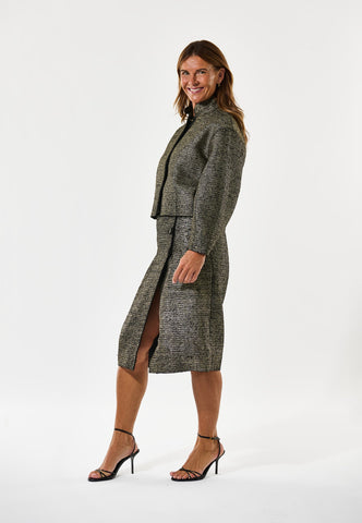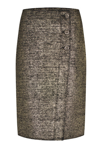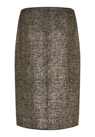 Slank, elegant og meget sofistikeret, denne nederdel i et luksuriøst guldboucléstof sidder tæt på hofterne og falder til under knæet. En asymmetrisk åbning foran lukkes af tre broderede knapper. Brug med en enkel skjorte eller strik eller lav et stilfuldt jakkesæt med den matchende Safa-jakke.