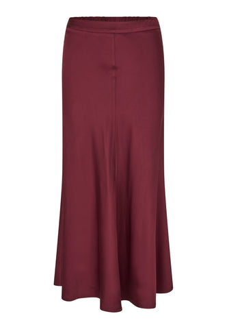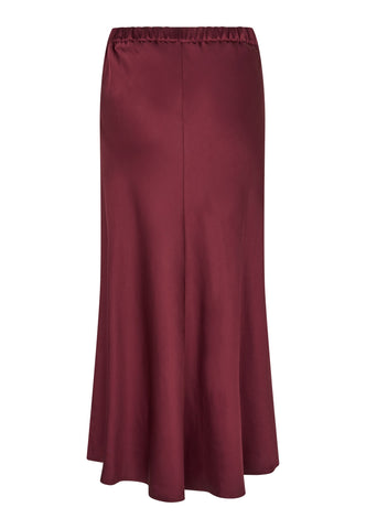 En asymmetrisk nederdel er en stilfuld og anvendelig garderobeklassiker. Denne udgave i bordeaux stretch-viskosesatin smyger sig om hofterne, før den falder til midt på læggen, og har en linning med elastik bagpå for ekstra komfort.
