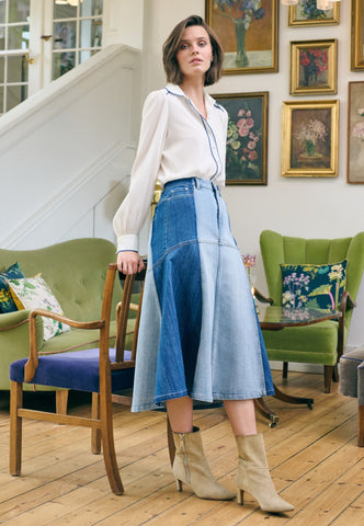 Med en smart kombination af både mørk og vasket denim sidder denne nederdel tætsiddende over hofterne, før den vidder ud og stopper midt på læggen. Jeanslommer, bæltestropper og metalnitter giver et urbant workwear-udtryk, og den ser fantastisk ud sammen med en skjorte eller en enkel strik.