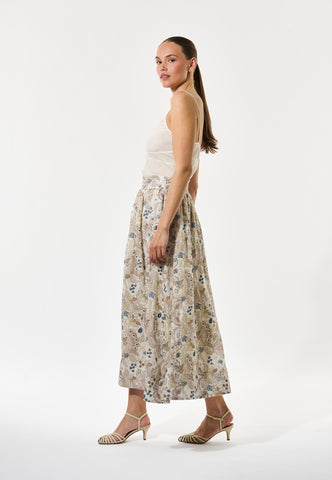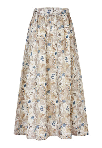 Denne smukke hørnederdel er både feminin og komfortabel til en sommerdag. Hørnederdelen har et markant blomsterprint som falder fra en bred, høj talje og har en fuld, vid form, der stopper ved læggen. Den er fuldt foret og har sidelommer, som giver et afslappet udtryk.