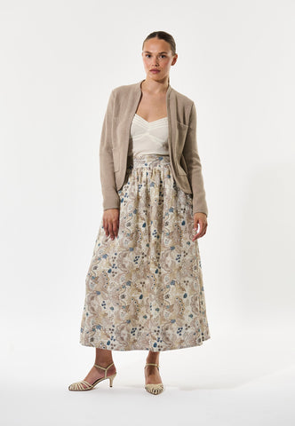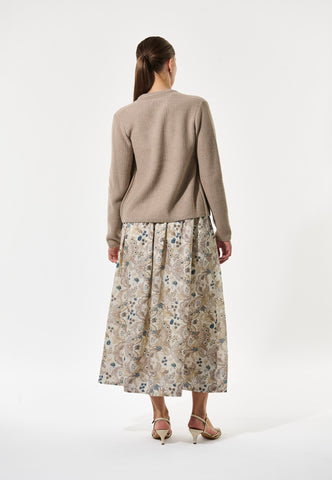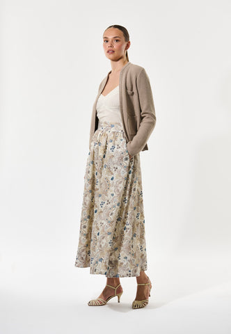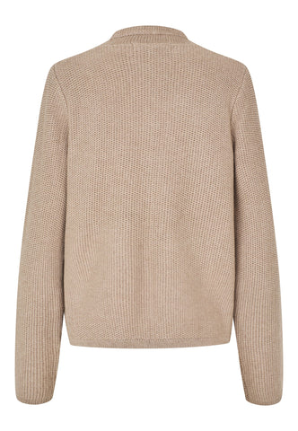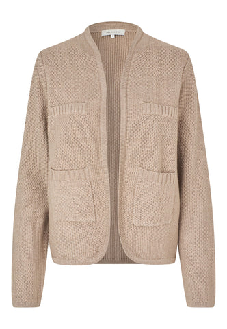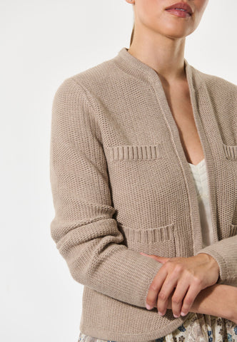 Halv jakke, halv cardigan – denne stilfulde strik er udført i en tung, struktureret kvalitet i en blød viscose-cashmere-blanding. I en varm biscuit-farve har den kort længde, to falske paspellommer på brystet og to påsyede lommer. Ribkanter løber langs kanterne og åbningen, og fronten er uden lukning.