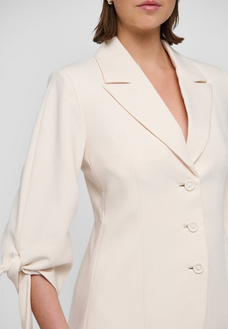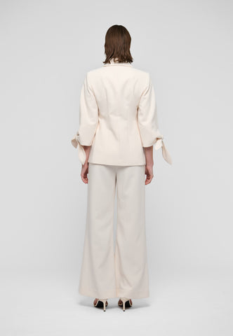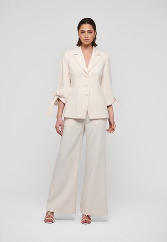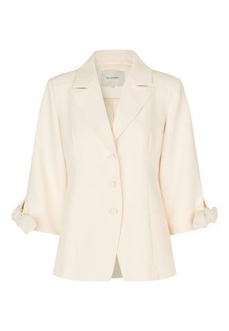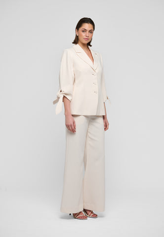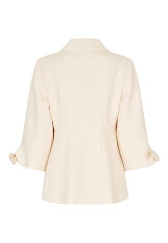 To sløjfer placeret ved ærmerne på 3/4 længde ærmer er uventede, men charmerende detaljer på denne tætsiddende jakke. Blazeren, der er lavet af cremefarvet viskose-crepe, har brede reverser og er lukket med tre dekorative knapper foran. Bær den alene eller lav som en del af en meget smart dragt med de matchende lamars-bukser.