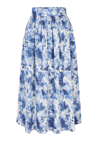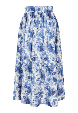 Denne smukke hørnederdel er både feminin og komfortabel til en sommerdag. Hørnederdelen har et markant blomsterprint som falder fra en bred, høj talje og har en fuld, vid form, der stopper ved læggen. Den er fuldt foret og har sidelommer, som giver et afslappet udtryk.