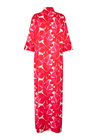 En elsket Dea Kudibal klassiker, HelgaDEA, er en afslappet pasform i fuld længde kjole med kimono-halsudskæring, stående krave og 3/4 længde brede ærmer. Denne version kommer i silke med et markant print af forstørrede blade i nuancer af rød og pink.