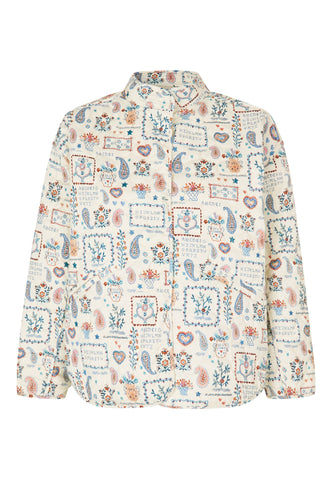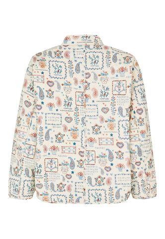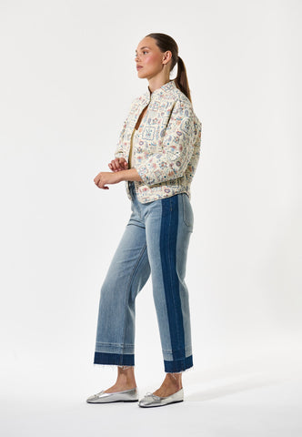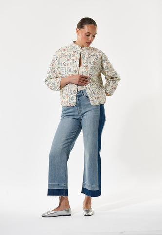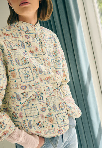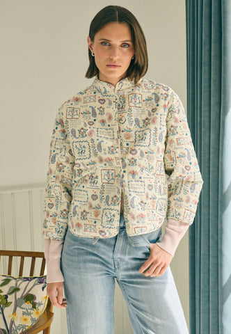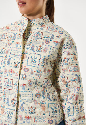 Komfortabel, men alligevel yderst chic – denne quiltede bomuldsjakke er perfekt til kølige forårsdag. Den er dekoreret med et charmerende print af broderede patches og motiver, og har en stående krave med flere syninger, kantbånd langs kanterne samt to diskrete stiklommer foran. Jakken har kort længde, ¾-ærmer og lukkes med betrukne trykknapper.