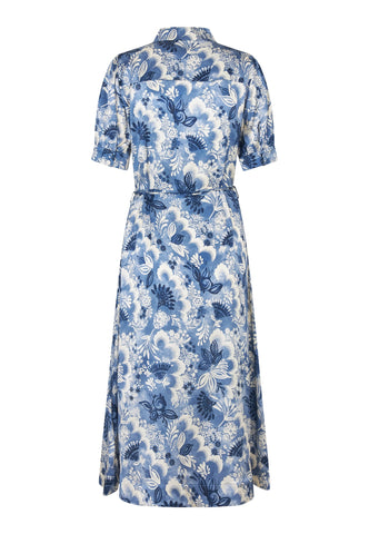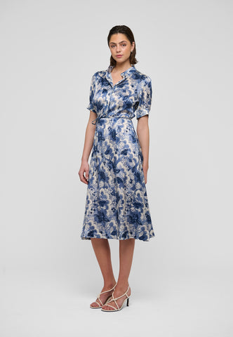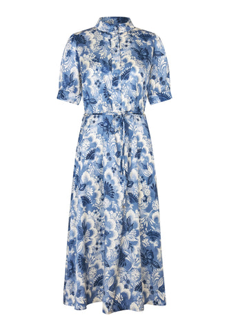 Med sin smalle ståkrave og korte manchetærmer er denne kjole i blå blomsterprintet silk-twill et chic og anvendeligt valg til forår og sommer. Overdelen samles i taljen med et bindebånd i samme stof, og skørtet falder blødt til midt på læggen. Betrukne knapper foran tilføjer et charmerende finish.