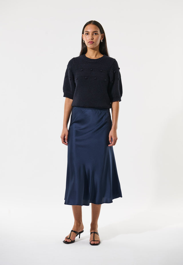Enkel, men meget chic. Denne elegante nederdel i midnatsblå silke falder let ud fra hoften og ned til midt på læggen. Brug den med en strik om dagen eller med en skræddersyet jakke om aftenen.