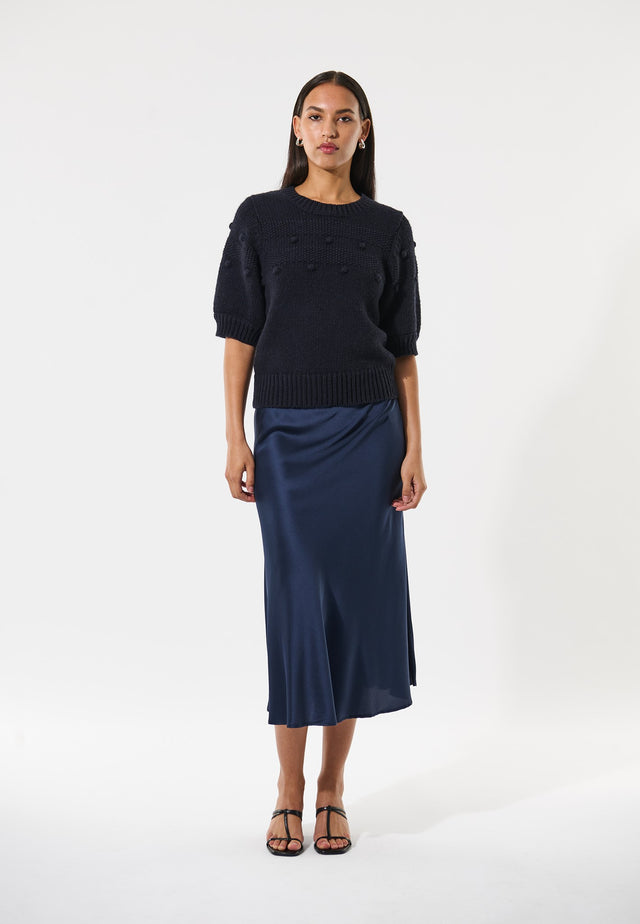 Denne figursyede sweater i marineblå bomulds-/uldblanding er pæn og chik, og har korte pufærmer, der giver den et vintage retroinspireret udtryk. De horisontale teksturerede striber har 3D prikker, der tilføjer en subtil detalje til trøjen.