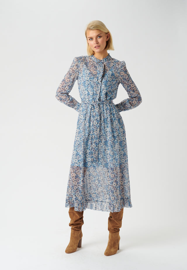 Kjole med flæsedetaljer ved stolpe og bælte i taljen.