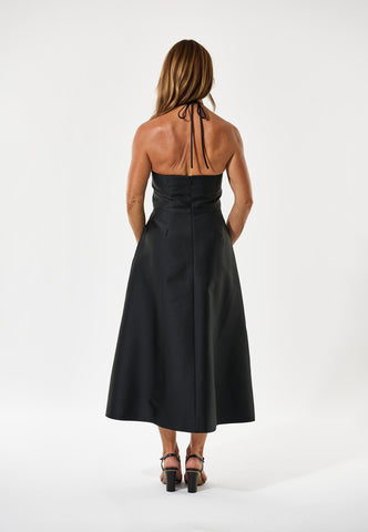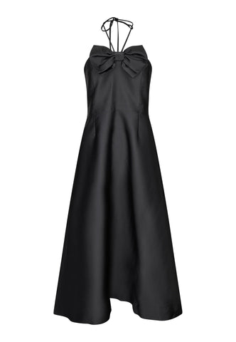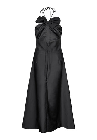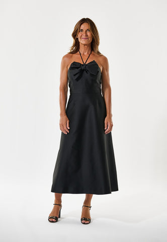 Denne sorte taftkjole er det ultimative cocktailparty-outfit og har en tætsiddende overdel, der blusser ud i en nederdel, der falder til midten af læggen. Bustier toppen er dekoreret med en stor dekorativ sløjfe, og skosnorstropper kan også bruges til at binde i nakken. Bagsiden af kjolen er skovlet lavt og lukket med en tildækket lynlås.