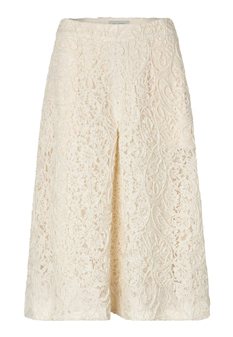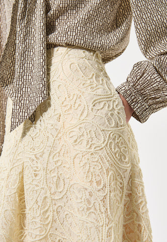 Denne nederdel er starter ved hofterne, før den snit har en smart A-linje, der slutter midt på læggen, og lader den smukke cremefarvede blonde være i centrum. Et stort læg foran giver nem bevægelse, og der er en skjult lynlås midt bagpå. Nederdelen er fuldt foret.