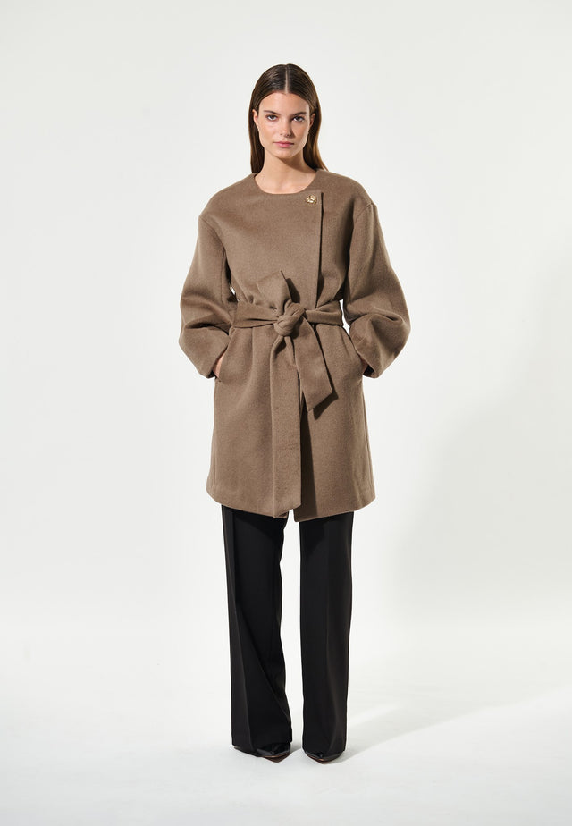 Denne ubesværet stilfulde beige frakke uden krave med asymmetrisk front er en elegant tilføjelse til garderoben. Frontpanelet holdes på plads med en enkelt dekorativ knap ved skulderen. Den har skulpturelle 'kokon'-ærmer, stiklommer i sidesømmene og et bælte i samme stof, der trækker den ind i taljen. Frakken er fuldt foret og falder til lige over knæet.