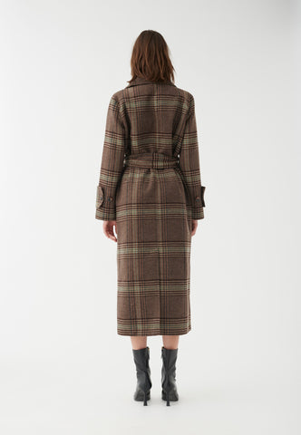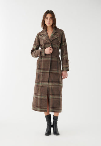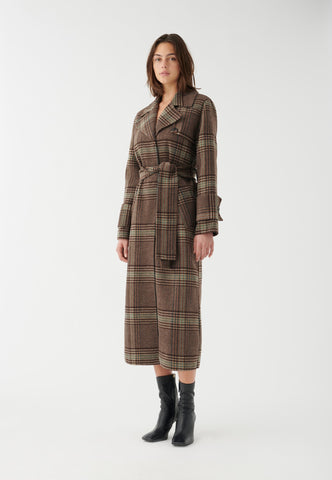 Perfekt til vinterdage, denne frakke i uldblanding har en klassisk og tidløs fornemmelse af sofistikation. Bindebæltet fremhæver silhuetten, mens de overdimensionerede manchetter og det dristige ternede mønster tilføjer et moderne præg.