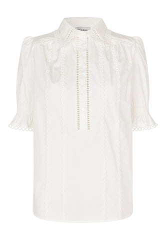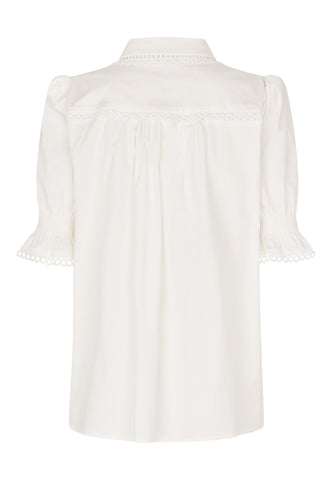 Det ultimative inden for feminin chic – denne hvide poplinskjorte har blondekant ned foran, omkring kraven og ved manchetterne. Med almindelig pasform har den korte ærmer, puffede ved skulderen, og elastik ved manchetterne. Brug den til jeans for et afslappet look, eller kombiner med et skørt til aftenen for et mere elegant udtryk.