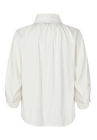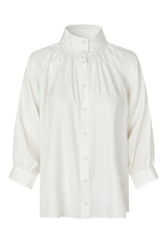 Fremstillet i hvid silkesatin er denne skjorte både afslappet og stilfuld. Små læg foran og bagpå samler stoffet op i den højtsiddende ståkrave med flerfoldssyninger, og skjorten har fyldige 3/4-ærmer.