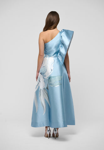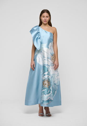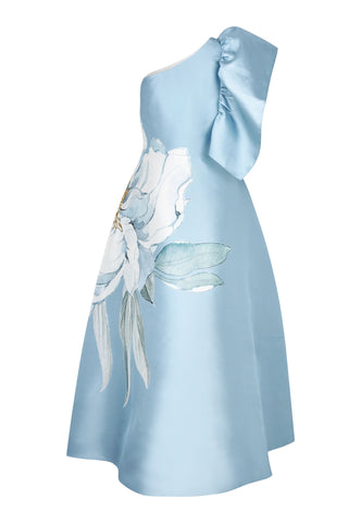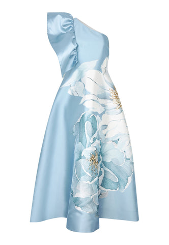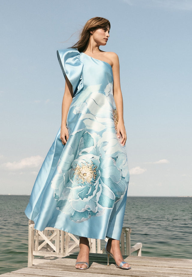 Dramatisk i både silhuet og design: Denne kjole i tafttwill er figursyet i taljen og går derefter ud i en vid nederdel, og den ene skulder er dekoreret med en stor flæse. Det markante print med en oversized, malerisk blomst på en sart blå bund vil tiltrække opmærksomhed ved enhver aftenlejlighed.