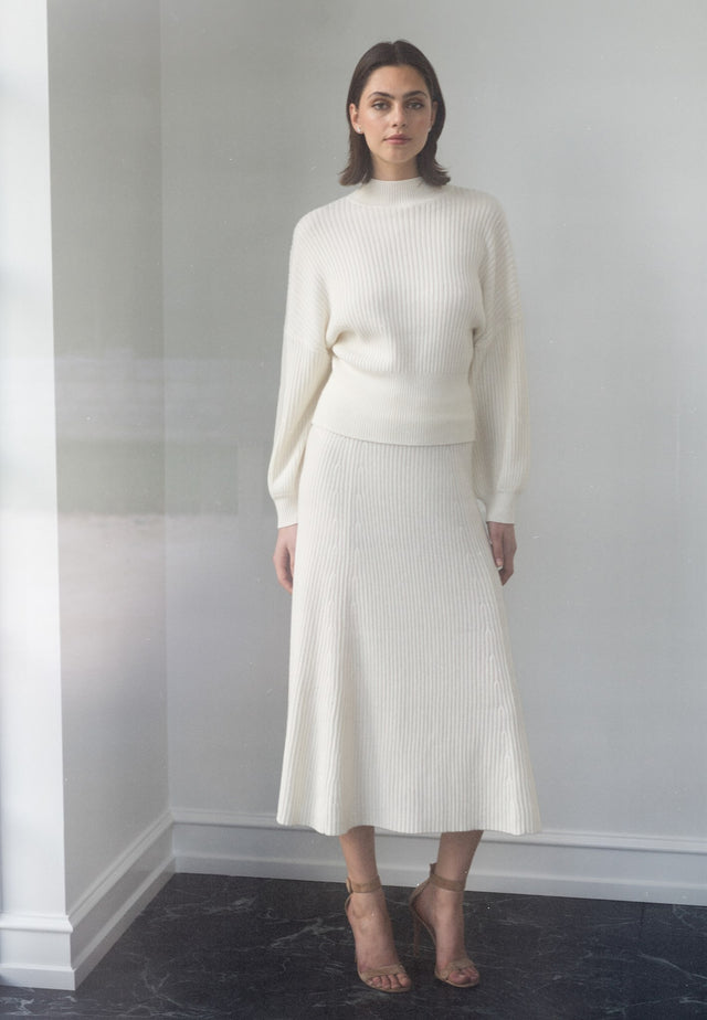 Denne hyggelige og stilfulde ribstrikkede nederdel til midt på læggen sidder tæt til hofterne, før den breder sig ud med fine modedetaljer. Den har elastik i taljen for ekstra komfort og er lavet af en blanding af uld, bomuld og cashmere i en fyldig cremefarve.
