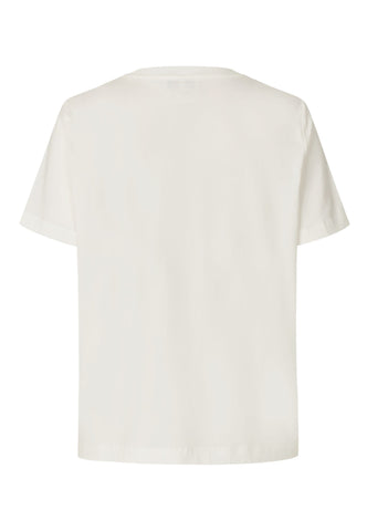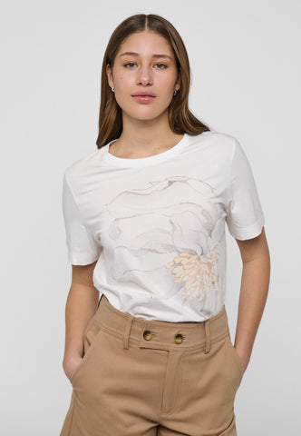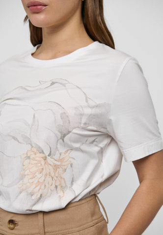 En enkel jersey T-shirt med et stort, kunstnerisk blomsterprint på fronten, der giver et blødt og feminint udtryk. Modellen har klassisk rund hals med ribkant samt et diskret logo i nakken bagpå. Brug den afslappet til jeans eller chinos – eller style den under en blazer for et mere elegant og moderne look.