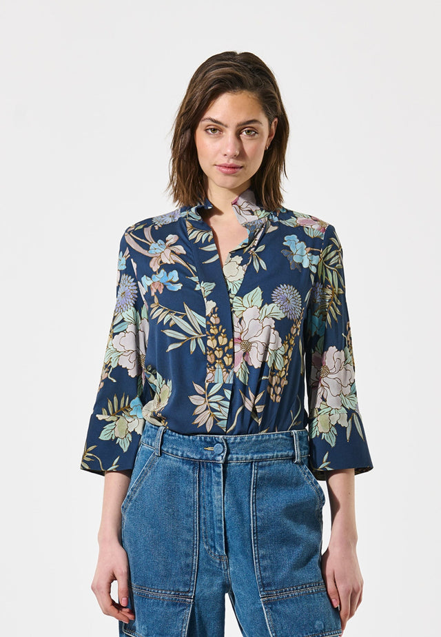 Smuk viskosebluse i blåt, grønt og lys pink tonet blomsterprint med dyb V-udskæring. Blusen har 3/4 ærmer og en løs pasform, hvilket skaber et feminint og sofistikeret look. Perfekt til både hverdagsbrug og festlige lejligheder. Fås i størrelserne XXS til XXL ✓ Nem forsendelse og returnering ✓