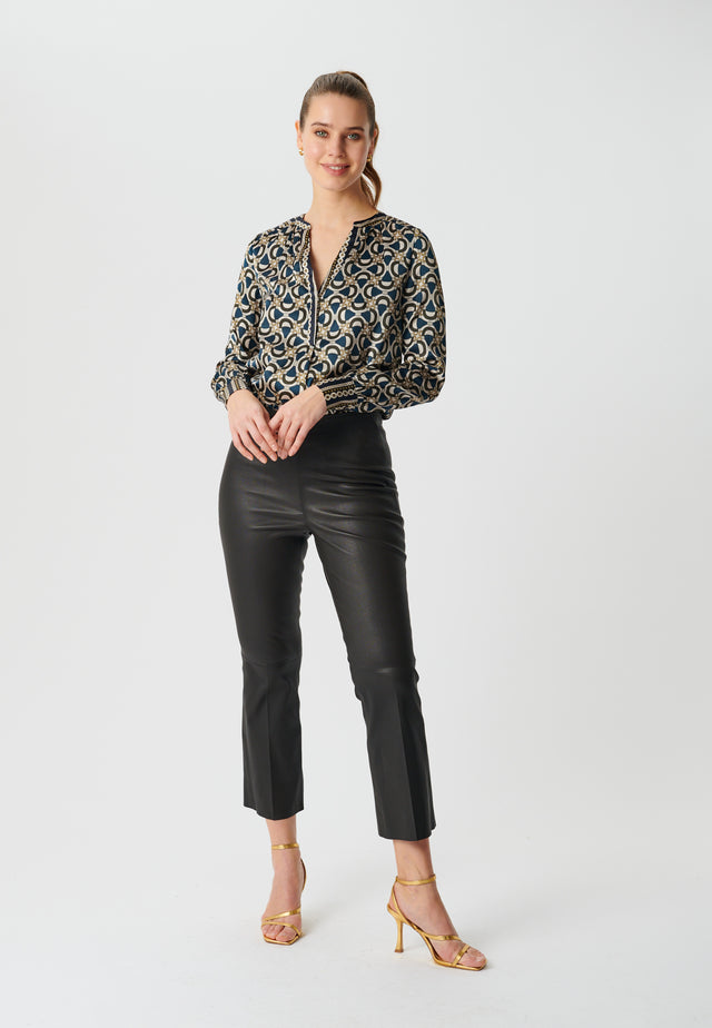 Et grafisk rideinspireret print, gengivet i luksuriøs stræksilke, har en kontrast nakkebånd, stolpe og manchetter for at tilføje den perfekte sidste detalje. Ydermere giver blide samlinger i nakken et strejf af lethed til blusen. Blusen er lavet af 92% stretch silke satin og 8% elastan.