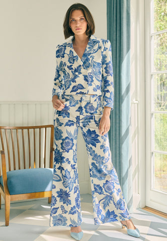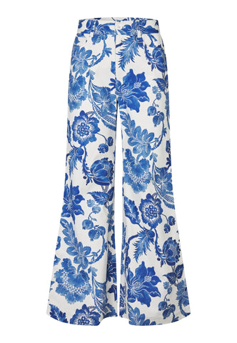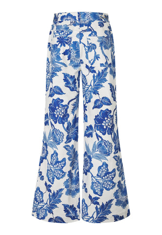 Tætsiddende over hofterne og med høj talje, før de vidder ud mod buksebenets kant, disse iøjnefaldende bukser præsenterer et dristigt print med store blå blomster. Western-inspirerede lommer foran og bagpå tilføjer et urbant twist. Bukserne kan bæres alene eller kombineres med DanielaDEA-blazeren for et komplet sæt.