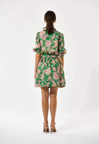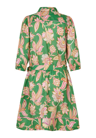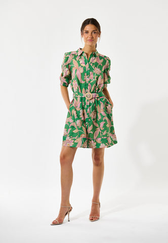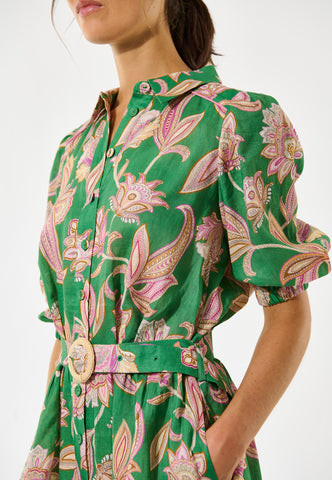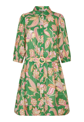 Chic og nem til sommer: Denne charmerende skjortekjole i hør med markant grønt paisleyprint slutter lige over knæet. Et bælte i samme stof med rafiaspænde giver et strejf af retro, og kontrastpiping ved søm og skuldre er en luksuriøs detalje.