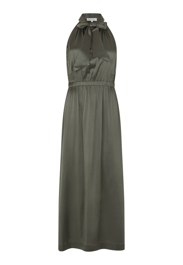 Sofistikerede og feminine halterneck kjoler tilføjer altid en dosis ægte glamour til aftenbegivenheder. Denne fuldlængde version har en tørklæde krave der kan bindes på mange forskellige måder og dybe slidser i siden. Silke satin stoffet er i en dyb nuance af khaki.
