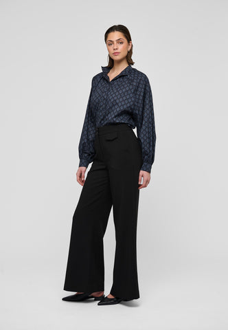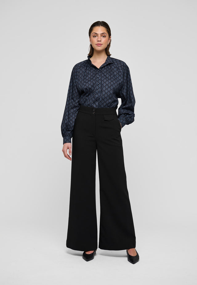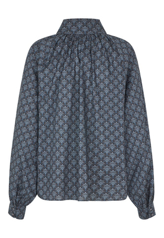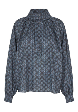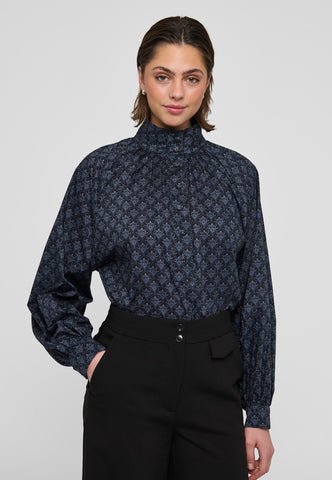 Fint tilbagelagte læg samler kroppen op i den højtsiddende, flerfoldssyede krave på denne løstsiddende bluse med raglanærmer. Bomuldsvoile med et diskret grafisk print og betrukne knapper giver blusen et sofistikeret og elegant udtryk.