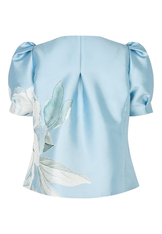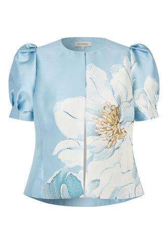 En kæmpe malerisk blomst trykt på fronten giver denne taftjakke med puffærmer masser af drama. Den er uden krave og lukkes foran med hægte og malje; den korte jakke er formet i taljen. Brug den til bukser eller en ensfarvet nederdel – eller sæt den sammen med den matchende Albis-nederdel for et iøjnefaldende look.