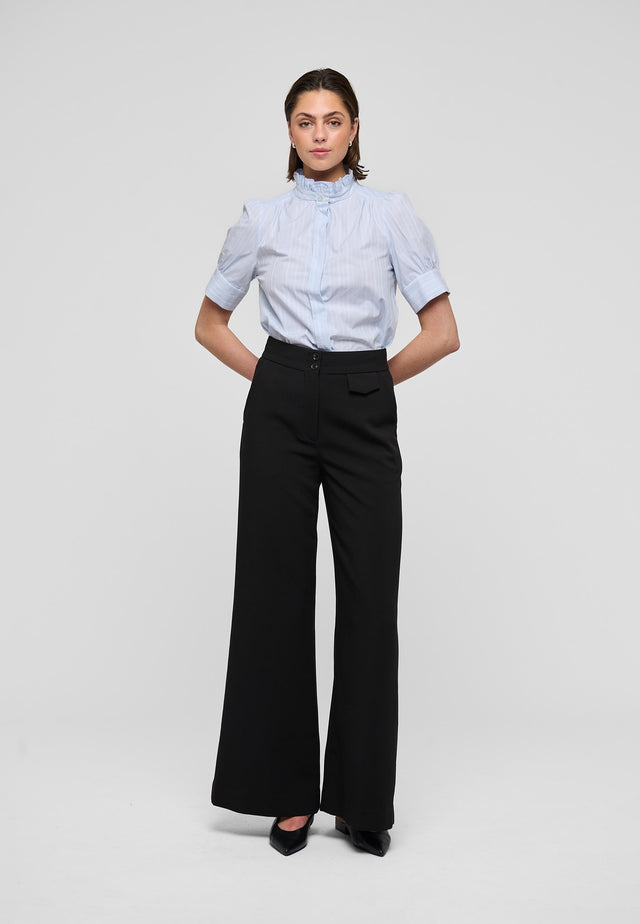 Denne sofistikerede og elegante kortærmede bluse i lyseblå stribet poplin har to flæser, der danner en stående krave, samt skjulte knapper foran. Små læg foran og bagpå ved halsen skaber fine detaljer, og blusen har aftagelige skulderpuder i samme stof.