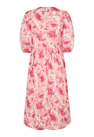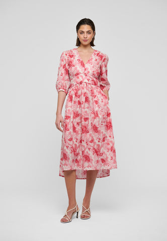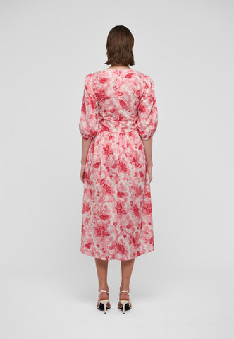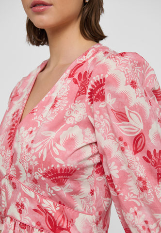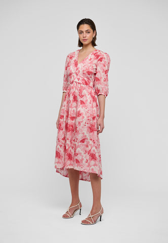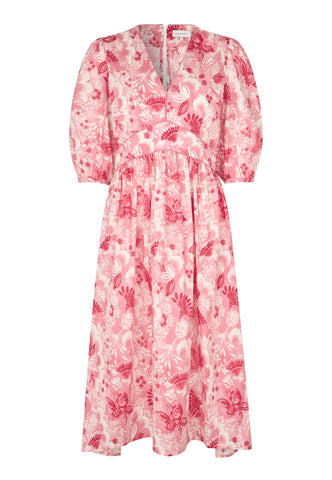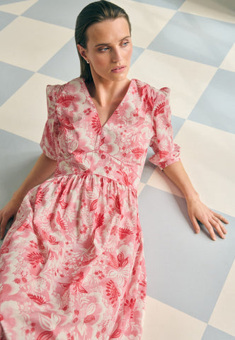 Et kontureret stykke i taljen, defineret af kontrastpiping, fremhæver taljen i denne smukke bomulds-voilekjole med v-hals, trykt med eksotiske blomster i pink og rød. Ærmer i fuld ærmelængde bidrager til den feminine silhuet, ligesom et udvidet skørt, der falder til midt på læggen.