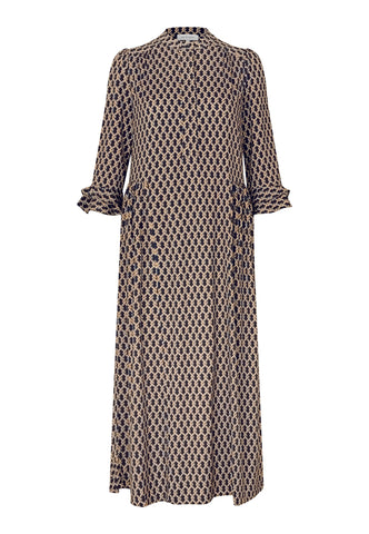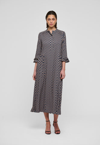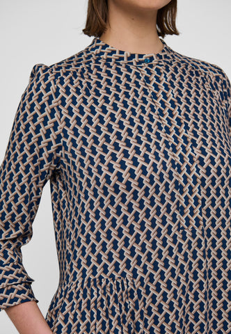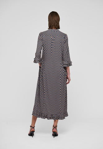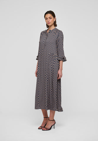 Et lille grafisk print på viskosecrepe giver denne ankellange kjole med 3/4 ærmer et sofistikeret udtryk – den er både klassisk og meget stilfuld. Der er dobbelte flæser på ærmerne og bagpå forneden samt rynker på ærmerne.