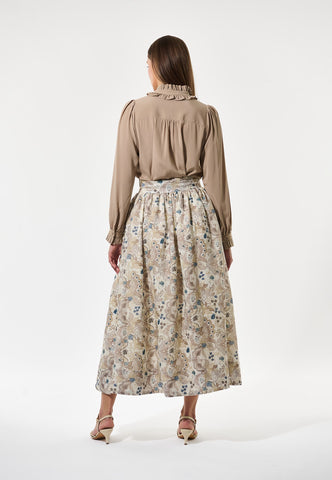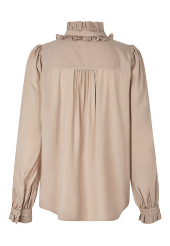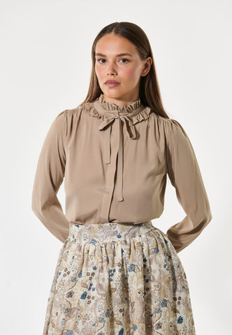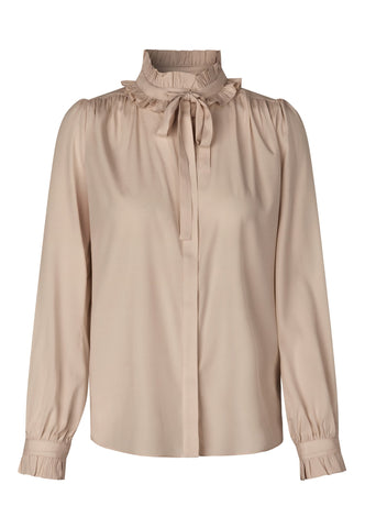 To rækker flæser, holdt sammen med en sløjfe i selvstof, danner en dramatisk krave på denne stilfulde og sofistikerede bluse lavet af blød beige silke. Fyldige ærmer bidrager til silhuetten, og små flæser fuldender manchetterne.