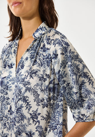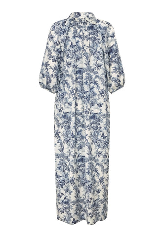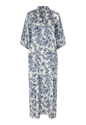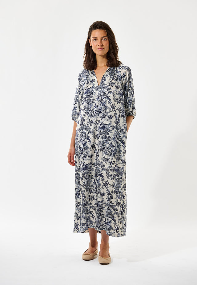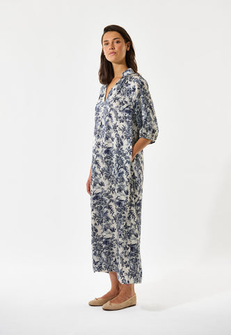 Med let pasform, men stadig sofistikeret og flatterende: Denne ankellange, kaftan-inspirerede silkekjole har et raffineret botanisk ætsningsprint i marineblå. En meget alsidig tilføjelse til garderoben – afslappet nok til hjemmebrug, men elegant nok til mere særlige anledninger.