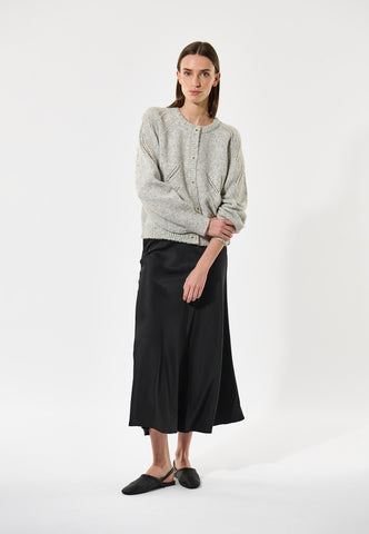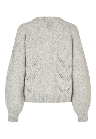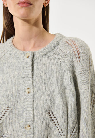 Oversized detaljer skaber et delikat dekorativt mønster foran, bagpå og på ærmerne af denne cardigan i uldblanding. Den har rund hals og voluminøse ærmer og fungerer som et hyggeligt og stilfuldt lag til kølige dage.