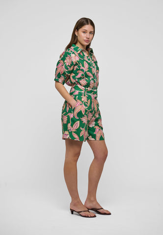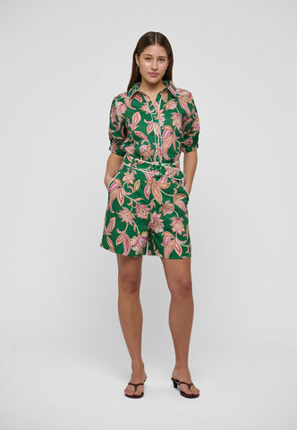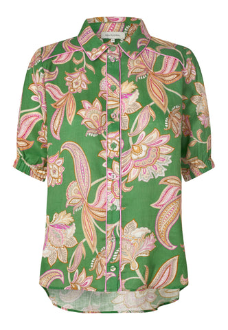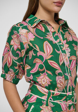 En kortærmet skjorte i hør er den perfekte tilføjelse til sommergarderoben. Denne version har klassisk krave og let pasform og kommer i et markant grønt paisleyprint med kontrast pink piping-detaljer.